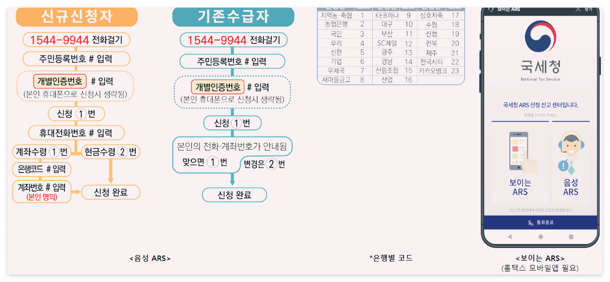 ARS 전화: 1544-9944로 전화를 걸어 신청할 수 있으며, 주민등록번호와 개별인증번호를 입력하면 간편하게 신청할 수 있습니다.