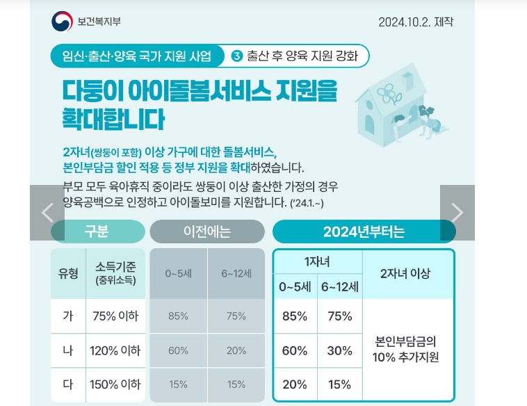 2024년 1월부터 2자녀(쌍둥이 포함) 이상 가구에 대한 돌봄서비스, 본인부담금 할인 적용 등 정부 지원을 확대하였습니다. 부모 모두 육아휴직 중이라도 쌍둥이 이상 출산한 가정의 경우 양육 공백으로 인정하여 아이돌보미를 지원합니다.