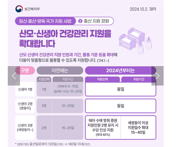 2024년 1월부터 산모·신생아 건강관리 지원 인원과 기간, 활용 기준 등을 확대하여 다둥이 맞춤형으로 활용할 수 있도록 지원합니다. 산모는 출산 후 회복에 전념할 수 있고, 신생아는 전문적인 케어를 받을 수 있습니다.