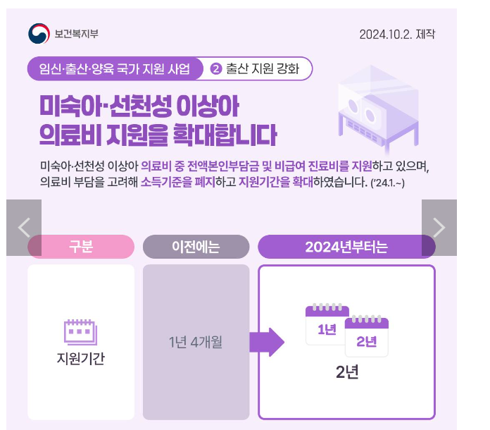 2024년 1월부터 미숙아·선천성 이상아의 의료비 중 전액본인부담금 및 비급여 진료비를 지원하고 있으며, 소득기준을 폐지하고 지원 기간을 확대하였습니다. 이를 통해 의료비 부담 없이 아이의 치료와 회복에 전념할 수 있습니다.