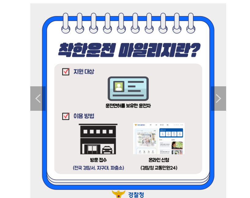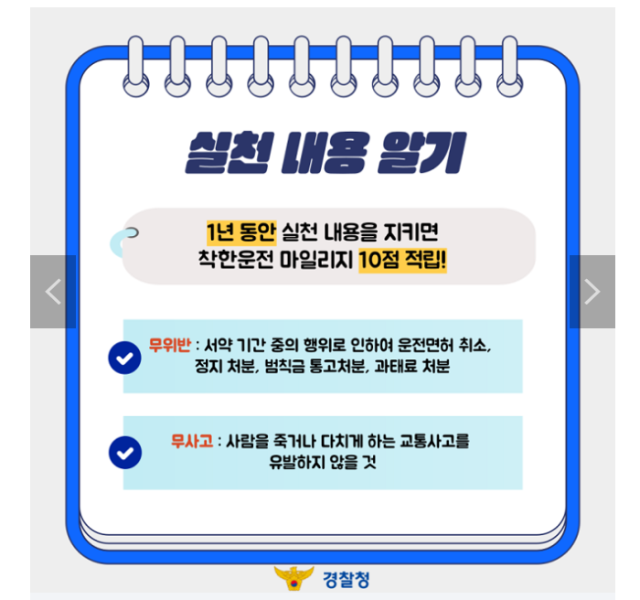 착한운전 마일리지는 운전자가 일정 기간 동안 교통법규를 준수하고 무사고·무위반 운전을 실천하면 이에 대한 보상을 제공하는 제도입니다. 경찰청에서 시행하는 이 제도는 교통안전에 대한 국민의 관심을 높이고, 선진 교통문화를 조성하기 위해 만들어졌습니다. 혜택: 1년 동안 무사고·무위반을 달성하면 운전면허 벌점 10점을 마일리지로 적립받을 수 있습니다. 적립된 마일리지 사용: 벌점 초과로 면허정지 처분을 받을 경우, 적립된 마일리지를 사용하여 면허정지 처분을 유예하거나 감면받을 수 있습니다.