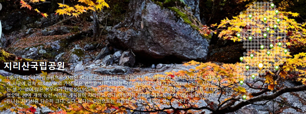 단풍구경 팁: 지리산의 가을 단풍은 다양한 수종의 나무들이 모여 있어 다채로운 색을 자랑합니다.